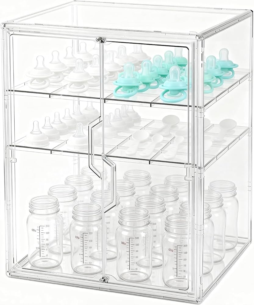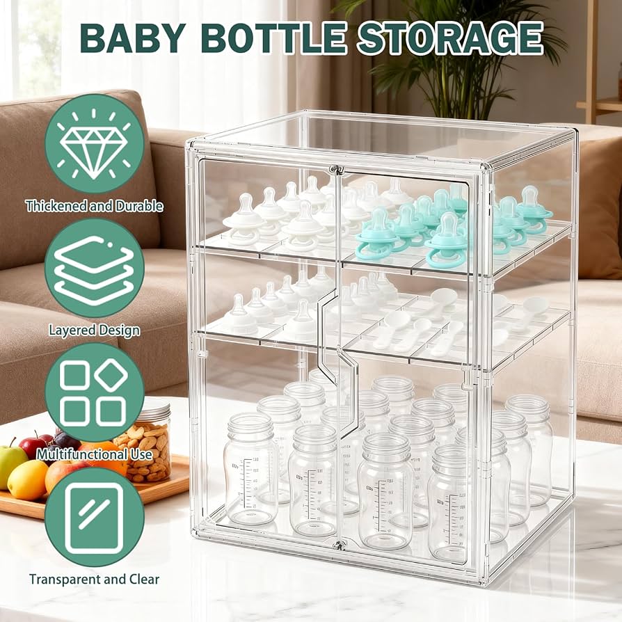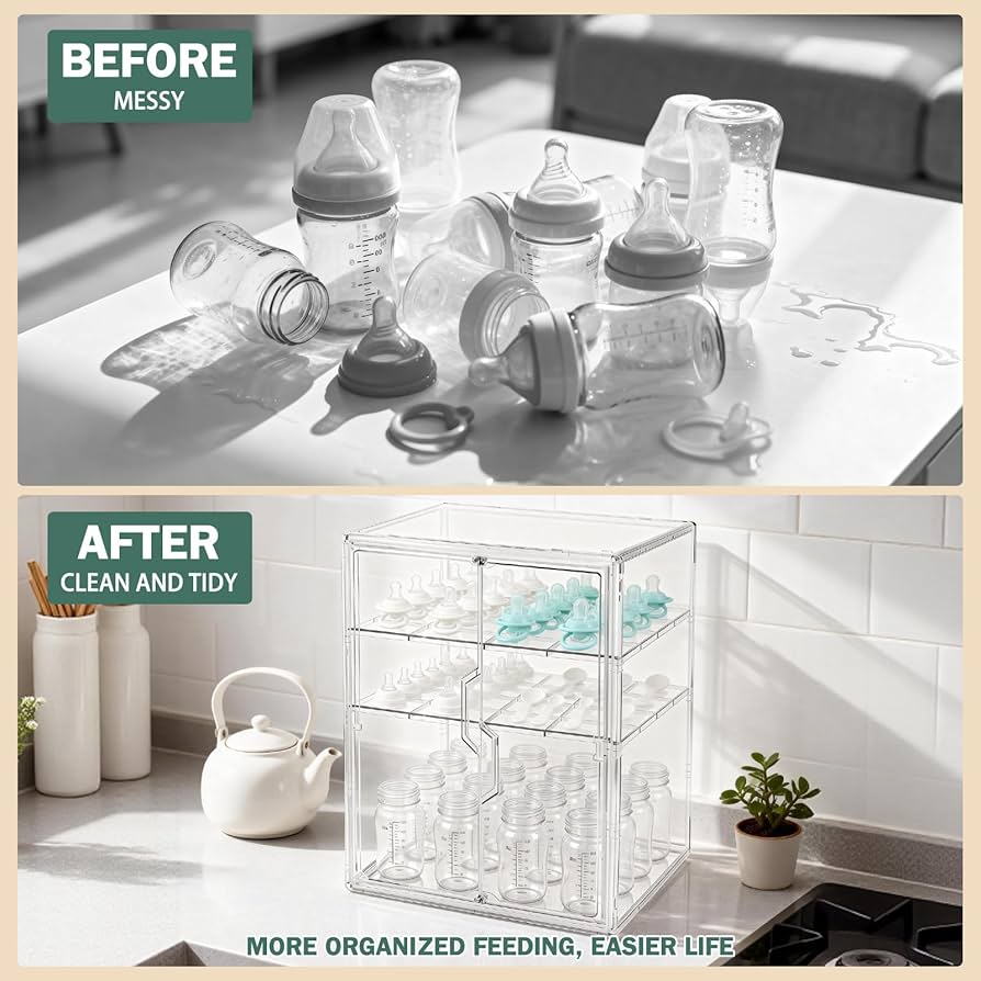 The three-tier baby bottle organizer is specifically designed for newborn bottles and feeding accessories, perfectly fitting bottles of various sizes, nipples, pump parts, and other essentials. It’s the ideal solution for organizing newborn feeding items